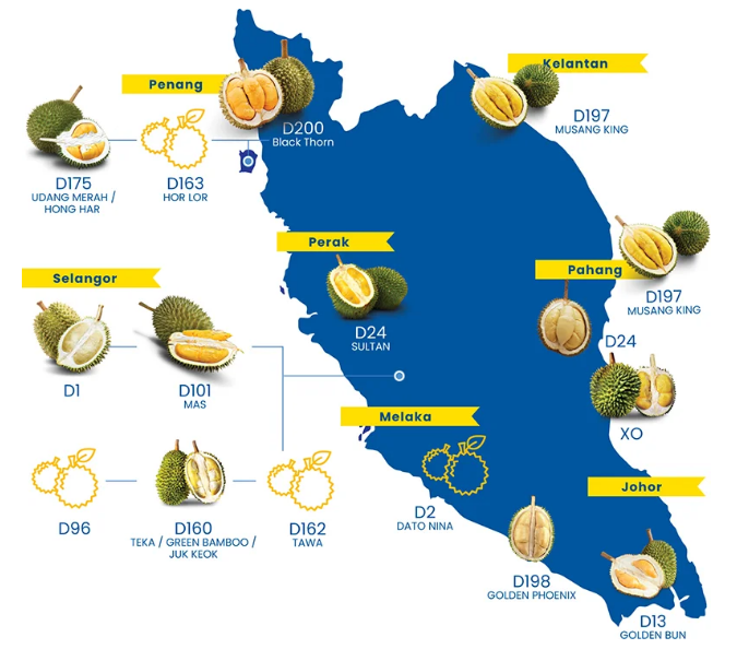 在馬來西亞,大約有200個(gè)榴蓮品種有自己獨(dú)特的風(fēng)味和香氣。同時(shí)它們也對(duì)適宜的生長(zhǎng)條件也特定的需要,例如降雨,海拔,溫度和土壤結(jié)構(gòu)。榴蓮僅在成熟季節(jié)才有供應(yīng)那發(fā)生在每年的六月和七月。那個(gè)時(shí)節(jié)成熟后從樹上自然掉落的榴蓮,往往會(huì)含有較多的果肉和更濃郁的香氣。